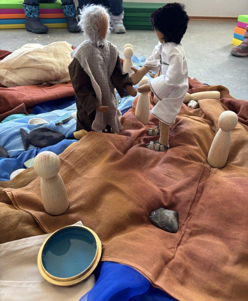 Mit einem großen blauen Tuch verwandelte sich der Raum in fließendes Wasser. Die Kinder spürten mit ihren Händen die Bewegung des „Wassers“, dachten darüber nach, wofür wir Wasser brauchen, und gestalteten Schritt für Schritt den Fluss Jordan. Muscheln, Steine und Fische ließen ein lebendiges Bodenbild entstehen, umgeben von sandfarbenen Tüchern, die die trockene Landschaft Israels sichtbar machten.